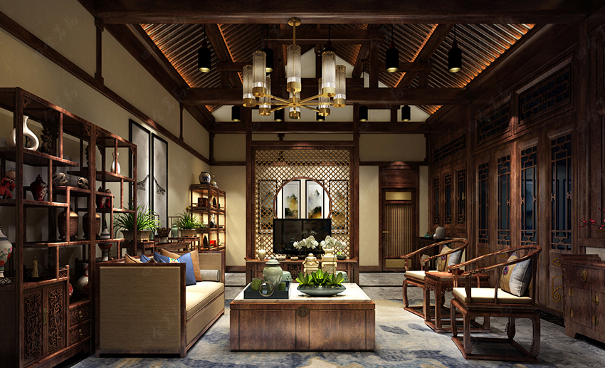 設計在空間布局上強調中式古典與現代的融合,根據室內外不同生活場景,增加空間的時光流動感。在仿古中增加現代的生活氣息,通過對比產生碰撞,再用設計師圓融的修飾筆觸將“矛盾”調和,以此手法研磨出巧妙的時代諧和感,讓空間氛圍顯得別具一格且富有文化氣息。